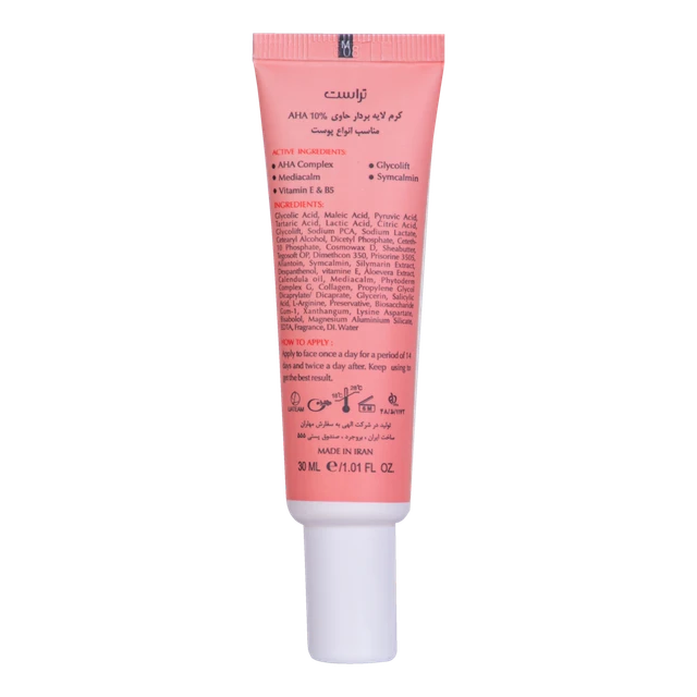 کرم لایهبردار تراست حاوی 10 درصد آلفا هیدروکسی با لایهبرداری سلولهای پیر و فرسوده، قدرت بازسازی پوست را به آن بازمیگرداند تا علاوه بر کم شدن میزان چینوچروکهای سطحی، پوستی یکدست، شفاف، جوان و روشن پیدا کنید.