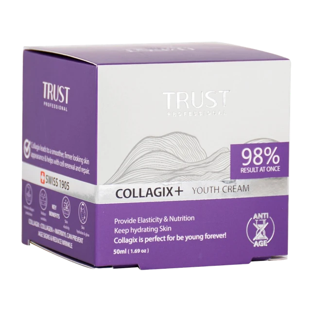 و در نهایت، پلی پپتاید آرژینین و لایزین موجود در کرم جوانساز کلاژن تراست، از ایجاد چینوچروک در پوست جلوگیری کرده و به حفظ شادابی و سلامت پوست کمک میکند. در کنار مواد مؤثره مطرحشده، این محصول تراست، با عصاره دانه لوپینوس آلبوس، به حفظ استحکام و افزایش خاصیت کشسانی پوست، با آسپارلین، به بهبود سوختوساز سلولهای پوستی و تکثیر آنها، با روغن آووکادو، به حفظ استحکام و پایداری پوست و با هلیانتوس آنوس سید اویل، به بهبود آبرسانی و جلوگیری از پیری پوست، کمک میکند.