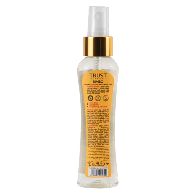 بادی میست زنانه تراست مدل Bimbo با گروه بویایی شیرین، وانیل، و میوهای در اختیار شما قرار میگیرد. با نتهای اولیه از انگور فرنگی و گلابی، این بادی میست با یک شروع شیرین و میوهای به شما خوشآمد میگوید.