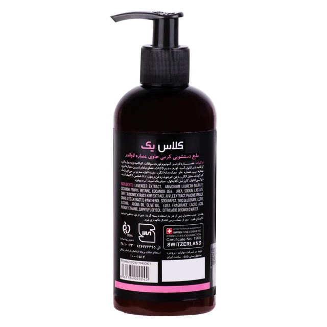 مایع دستشویی کرمی کلاس یک حاوی عصاره لاواندر، با شستشوی ملایم و عمیق پوست، تمام آلودگیها را از دستها پاک کرده و آن را تمیز و تغذیه میکند. همچنین این محصول با دارا بودن عصاره لاواندر از پیری پوست جلوگیری کرده و التهابات پوستی را تسکین میدهد. علاوهبر این، از پوسته پوسته شدن پیشگیری کرده و پوست را مرطوب میکند. مصرف این محصول، به روشن شدن پوست کمک میکند.