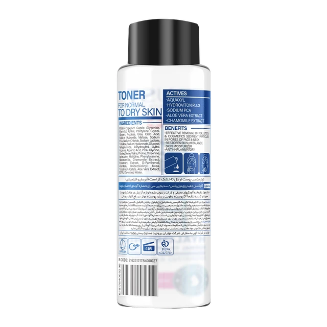 تونر مناسب پوست نرمال تا خشک تراست، با داشتن ماده آکواکسیل در ترکیبات خود، پوست را آبرسانی کرده و با ایجاد یک سد دفاعی روی پوست، مانعِ از دست دادن آب پوستی میشود. هیدروویتون پلاس در این محصول، مرطوبکننده قوی پوست بوده و سدیم پی سی ای این تونر از خشکی پوست جلوگیری میکند. همچنین عصاره بابونه در این ترکیب از آسیب رادیکالهای آزاد به پوست جلوگیری کرده و عصاره آلوئهورا التهابات پوستی را کاهش میدهد.