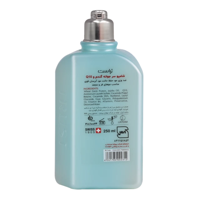 شامپو سر جوانه گندم و Q10 تراست، با داشتن پروتئین جوانه گندم، روغن جوجوبا و کوآنزیم کیوتن، از وز شدن تارهای موی شما جلوگیری کرده و حالت فر موهای شما را حفظ میکند. همچنین با استفاده از این محصول، تارهای مو و پوست سرتان آبرسانی شده و از خشکی آنها جلوگیری میشود.